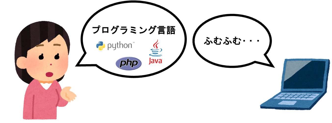 コンピュータには、人間のわかる言葉が理解できません。コンピュータが理解できる言葉でプログラムを作り、コンピュータに命令する必要があります。実際のプログラミングでは、人間がコンピュータに命令するために、プログラミング言語という特殊な言葉を使います。プログラミング言語は様々な種類がありますが、このサイトでは、Pythonというプログラミング言語を使用します。