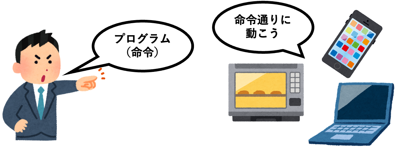コンピュータが動くためには、人間が命令をしてあげる必要があります。コンピュータに与える命令のことをプログラムと呼びます。プログラミングとは、プログラム(コンピュータに与える命令)を作り、コンピュータに対して命令する事で、コンピュータを制御する事です。プログラミングにより、家電やスマートフォン、パソコンといった様々な電化製品を自由自在に動かす事が可能です。